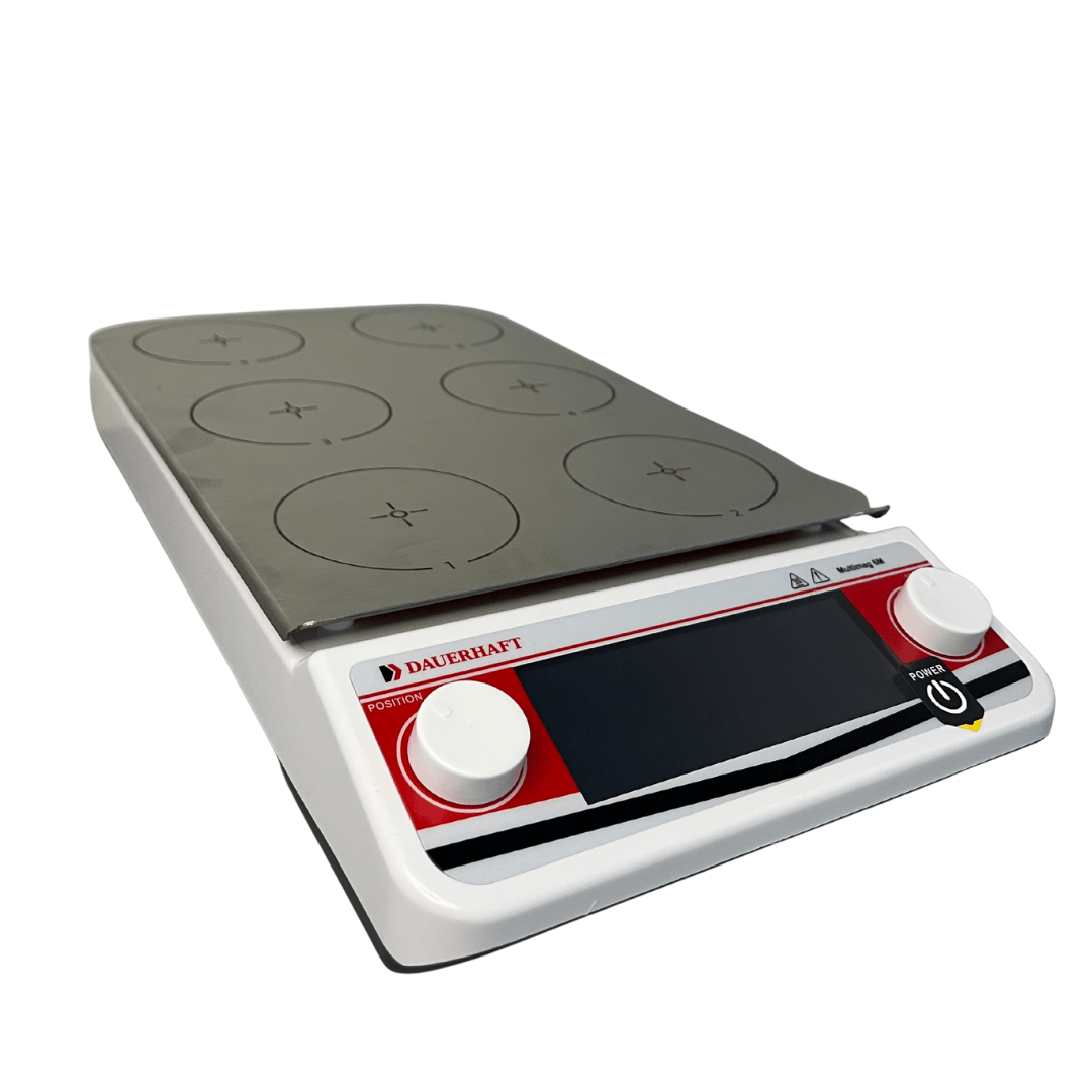 Agitador magnético múltiple de 6 posiciones con calefacción. Marca Dauerhaft, modelo Multimag 6M. Los agitadores magnéticos con calefacción Multimag de Dauerhaft están fabricados de acuerdo con conceptos y tecnología de diseño avanzado.