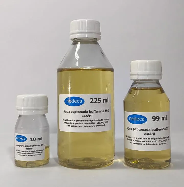 Diluyente recomendado para enrequecimientos de Salmonella y E.Colo 0157:H7 y diluciones en microbiología. Volumenes disponibles: 9 ml, 10 ml, 25 ml,40 ml, 90 ml, 99 ml, 225 ml, 585 ml, 3375 ml.