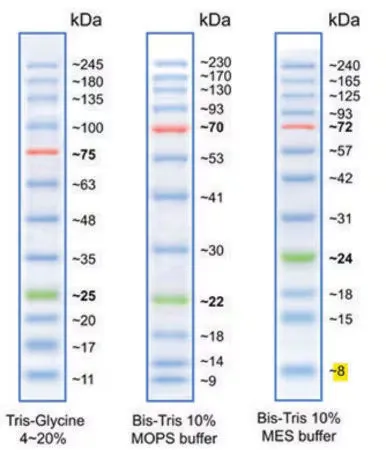 La escalera de proteínas BLUeye, lista para usar y teñida previamente, presenta 12 bandas nítidas en 11, 17, 20, 25, 35, 48, 63, 75, 100, 135, 180 y 245 kDa, ofreciendo más bandas que los marcadores comúnmente utilizados. Se suministra en un buffer de carga para geles. Una banda de referencia verde y otra roja facilitan la identificación de las proteínas. La escalera BLUeye prestained fue producida por GeneDirex, Taiwán.