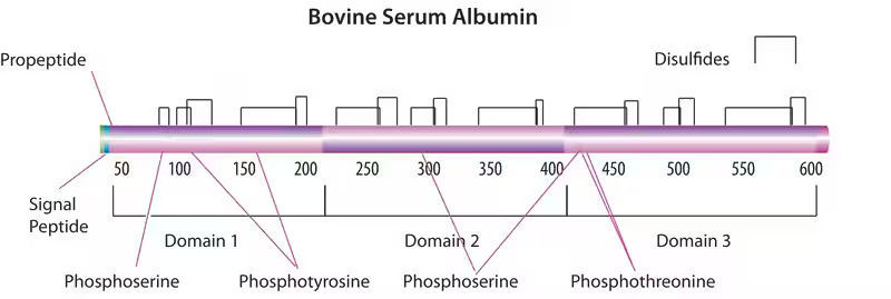 La BSA es una cadena polipeptídica única compuesta por aproximadamente 583 residuos de aminoácidos y no contiene carbohidratos. A pH 5–7, posee 17 enlaces disulfuro intramoleculares y un grupo sulfhidrilo.