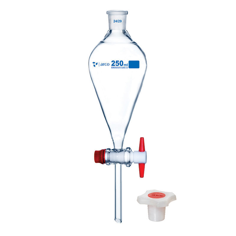 Embudo de decantación en vidrio borosilicato 3.3, conforme a ISO 4800. Ideal para separación de fases con alta resistencia térmica y química.