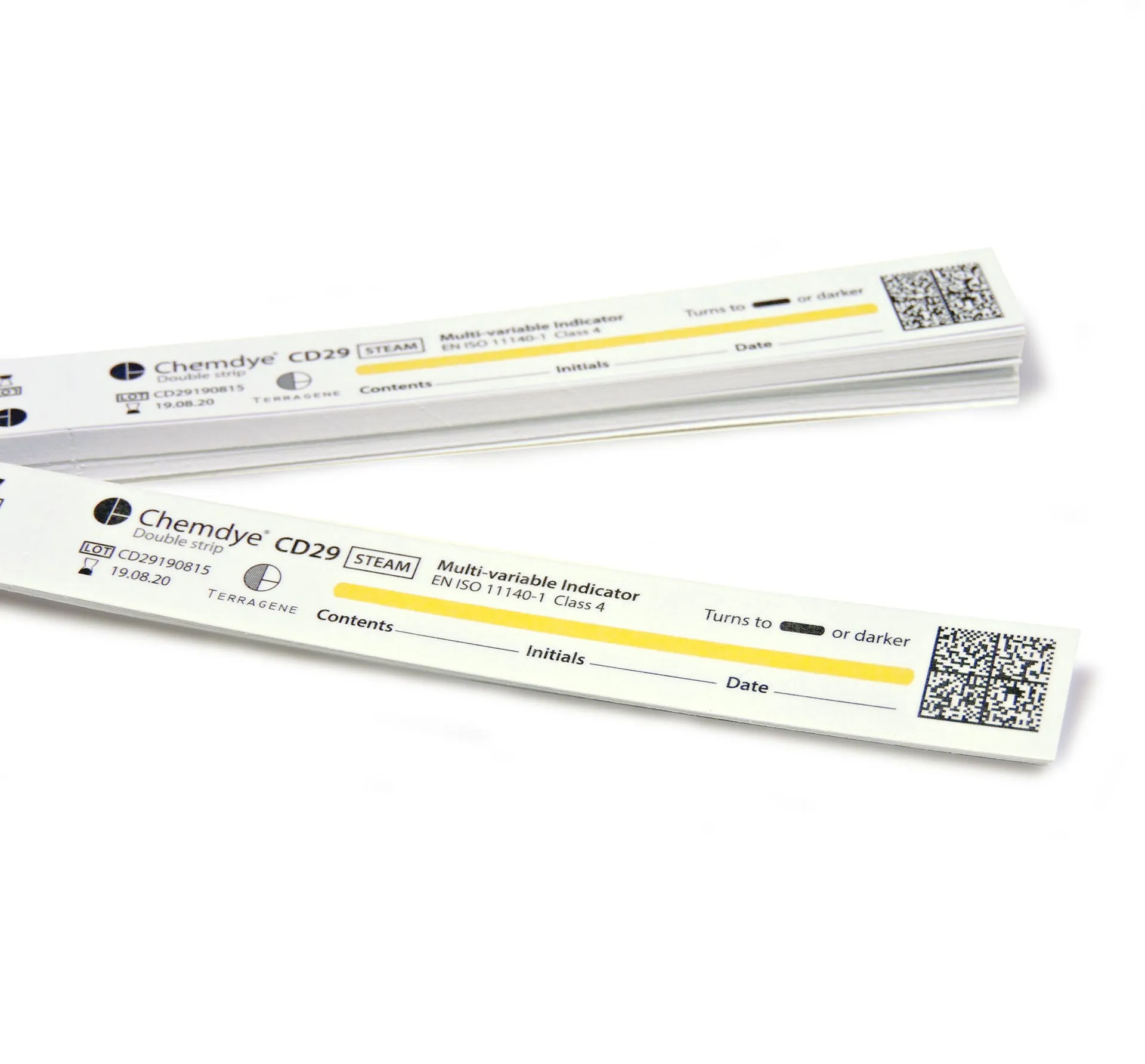 - Doble tira troquelada y unilaminada impresa con tinta indicadora. Tamaño: 200 x 15 mm.