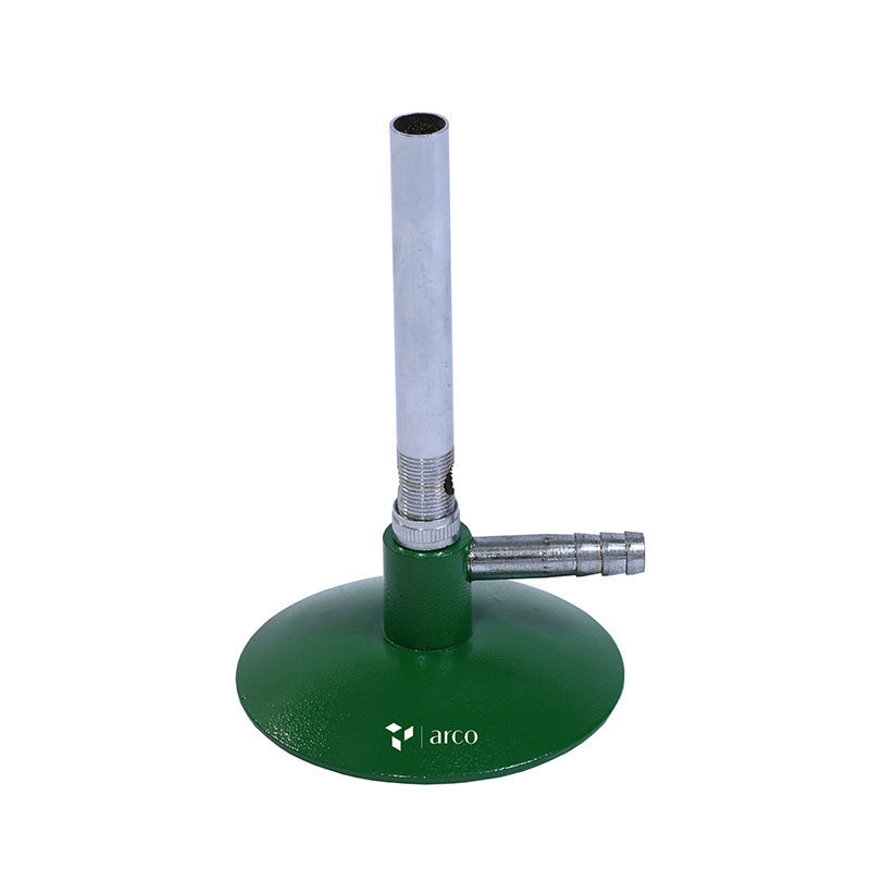 Mechero de laboratorio económico con tubo de latón niquelado (aprox. 100 x 12 mm) y regulador de aire giratorio roscado para un control preciso de la llama. Montado sobre una base metálica prensada de peso ligero y diseño estable (Ø aprox. 70 mm), ideal para usos generales en laboratorio. Incluye conector cilíndrico estriado que facilita una conexión segura con la manguera de gas. Es compatible tanto con gas natural (NG) como con gas licuado de petróleo (GLP).