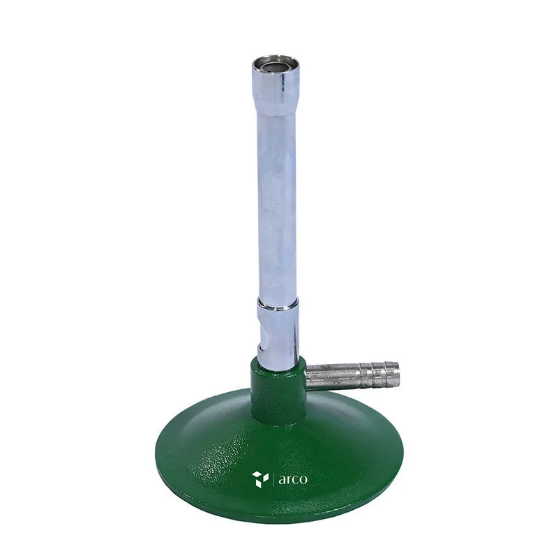 Mechero tipo Bunsen con tubo de latón niquelado (100 x 12 mm aprox.) montado sobre una base metálica pintada de gran estabilidad (Ø aprox. 70 mm). Incorpora un regulador de aire giratorio que permite controlar la mezcla de gas y aire para ajustar la intensidad de la llama. Cuenta con conector cilíndrico estriado para una conexión segura de la manguera. Su base robusta de chapa metálica gruesa proporciona mayor firmeza durante el uso. Apto para trabajar con gas natural (NG) y gas licuado de petróleo (GLP).