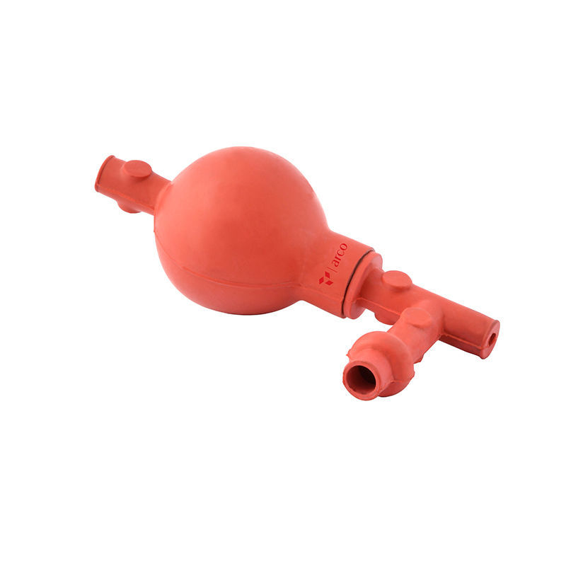 Bulbo dosificador rojo de goma suave con válvulas para pipeteo seguro de sustancias nocivas o desagradables. Capacidad: 50 mL.