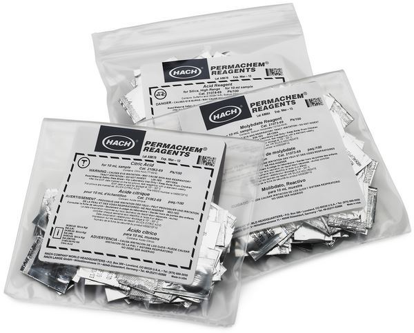 Para realizar determinaciones de sílice de alto rango mediante el método de silicomolibdato. Método 8185 de Hach. Rango: 1 - 100 mg/l SiO2. Tamaño de la muestra: 10 ml. El juego contiene almohadillas de reactivo en polvo de ácido, almohadillas de reactivo en polvo de ácido cítrico y almohadillas de reactivo en polvo de molibdato para 100 pruebas.