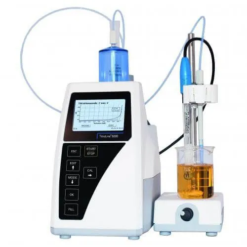 Incluye: TitroLine® 5000 con unidad de dosificación de 20 ml con electrodo Ag, con unidad de dosificación de 20 ml ensamblada lista para usar, controlador manual, pinza de titulación, varilla de soporte, agitador magnético TM 50 y fuente de alimentación 100-240 V.
